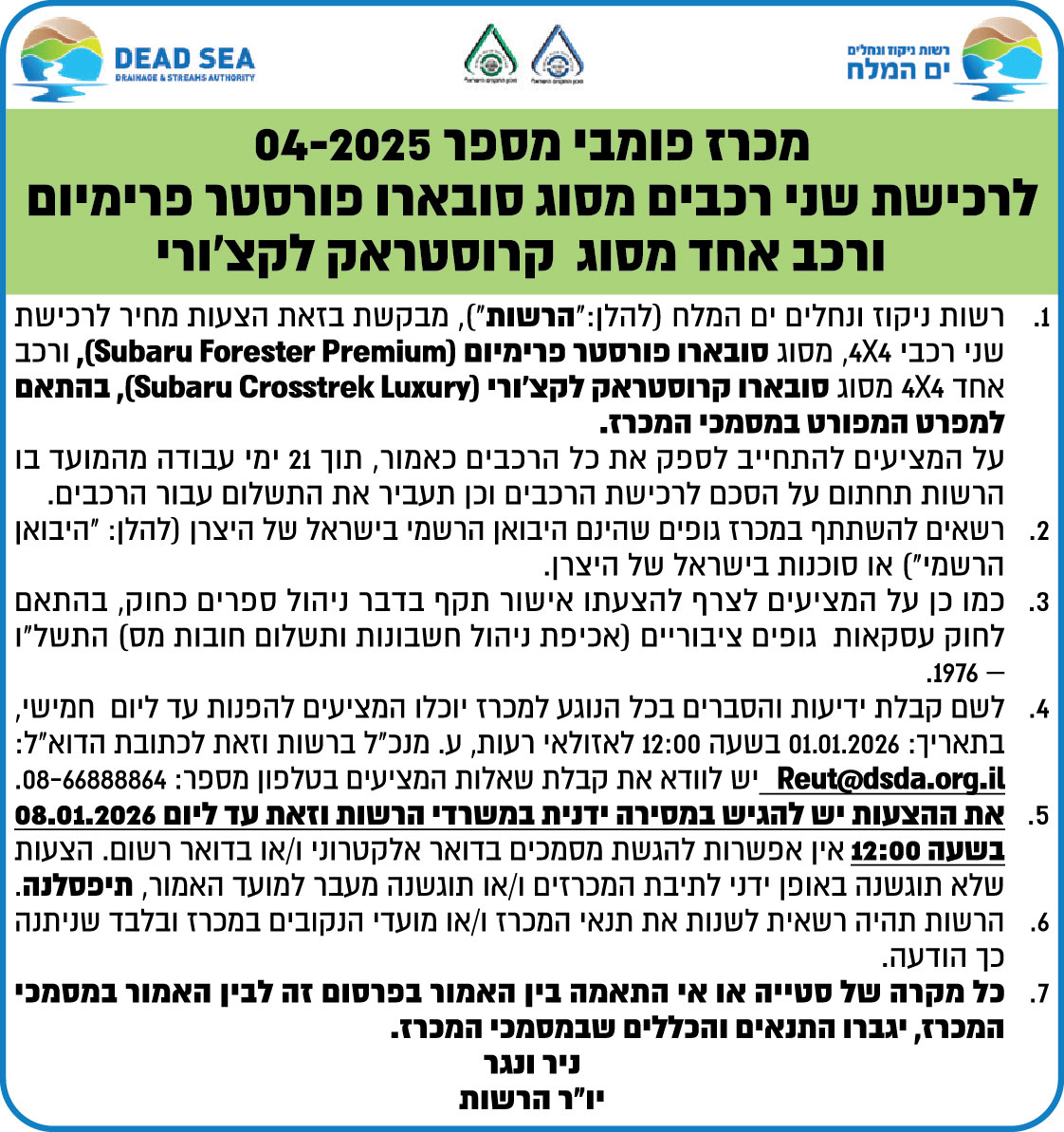 מכרז פומבי מספר 04-2025 לרכישת שני רכבים מסוג סובארו פורסטר פרימיום ורכב אחד מסוג קרוסטראק לקצ'ורי