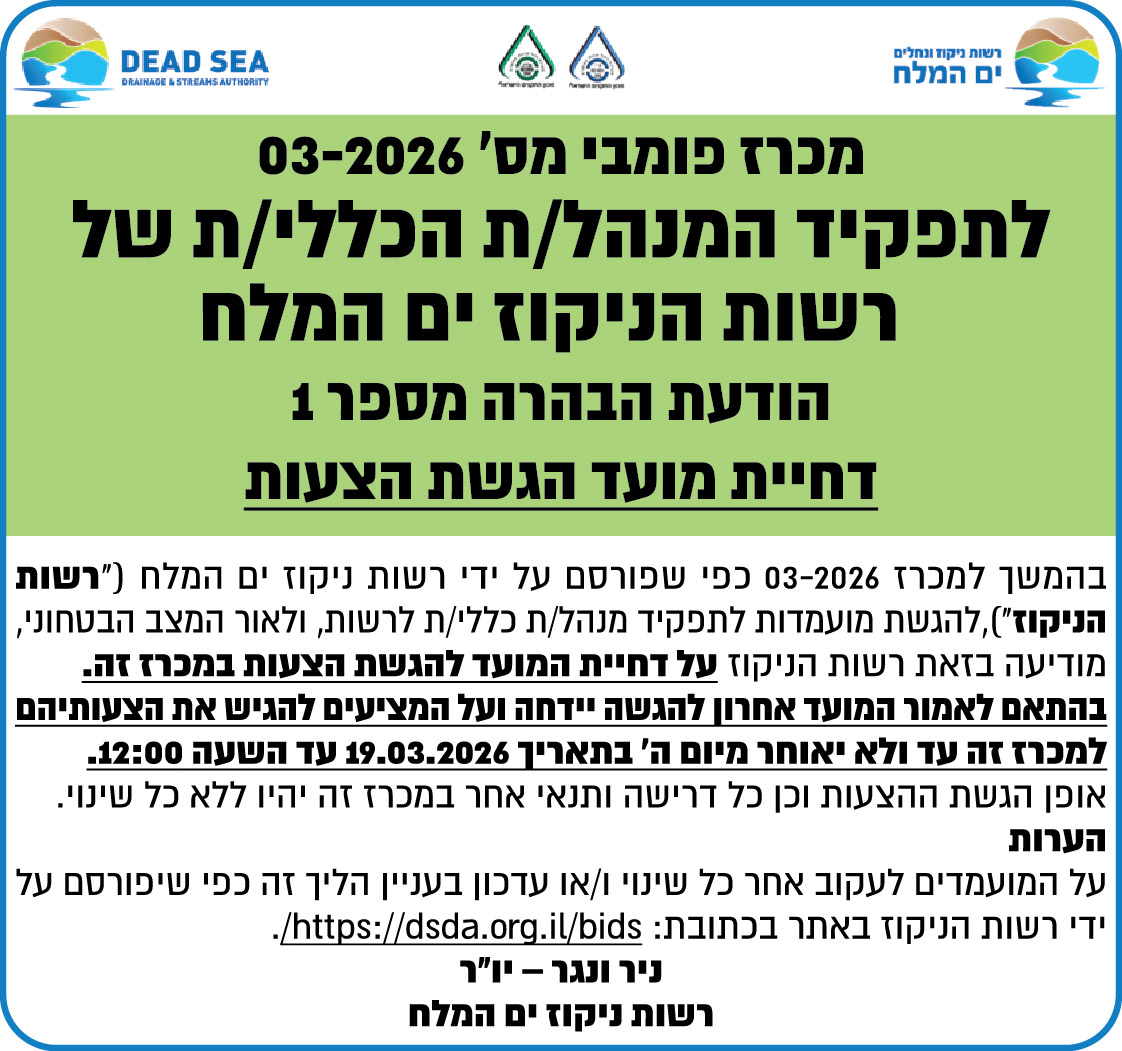 | מכרז פומבי מס' 03-2026 לתפקיד המנהל/ת הכללי/ת של רשות הניקוז ים המלח הודעת הבהרה מספר 1 | 09/03/2026 10:00 | 19/03/2026 12:00 | כח אדם | פומבי |