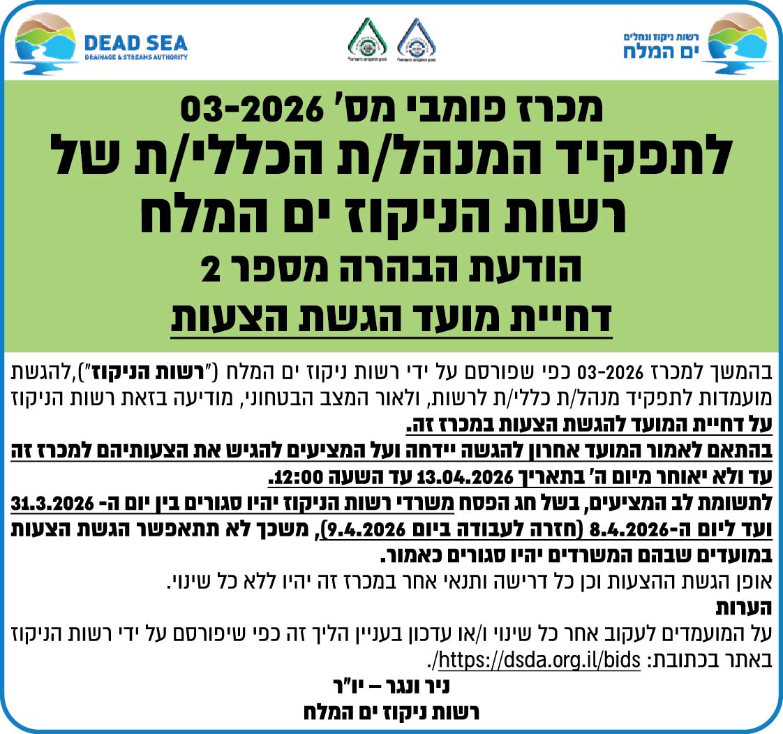 | מכרז פומבי מס' 03-2026 לתפקיד המנהל/ת הכללי/ת של רשות הניקוז ים המלח הודעת הבהרה מספר 2 | 17/03/2026 12:00 | 13/04/2026 12:00 | כח אדם | פומבי |